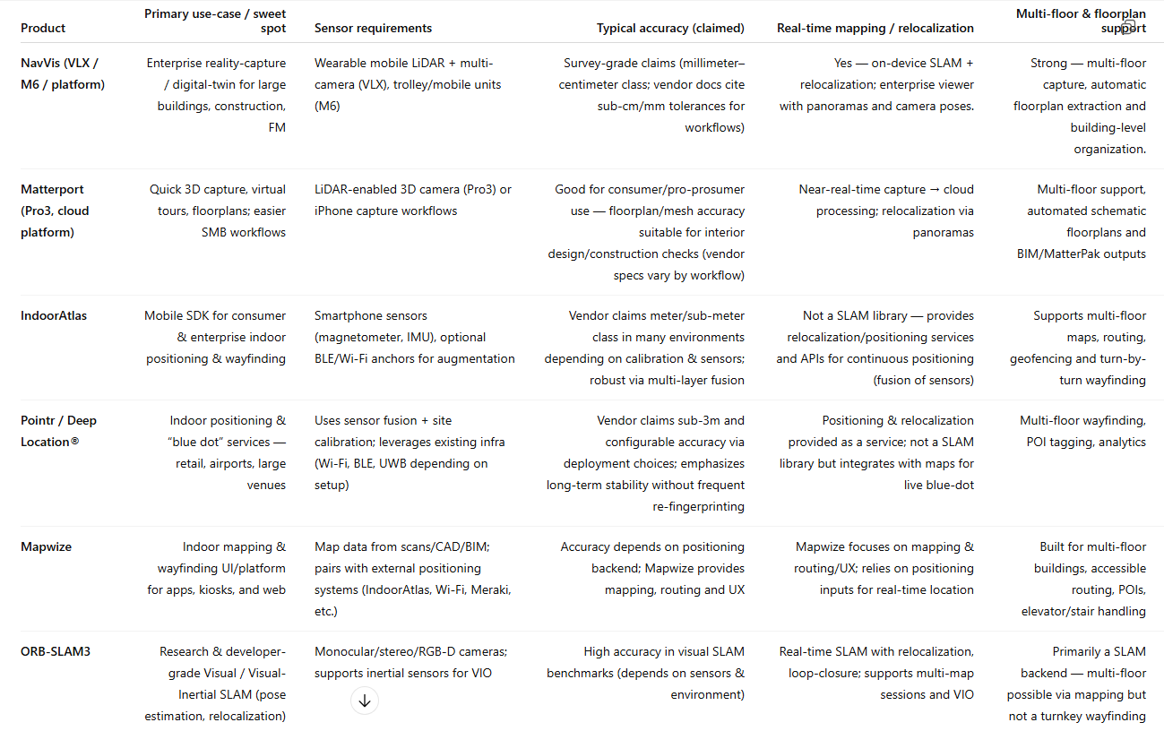 Product Comparison — NavVis, Matterport, IndoorAtlas, Pointr, Mapwize, ORB-SLAM3, and RTAB-Map