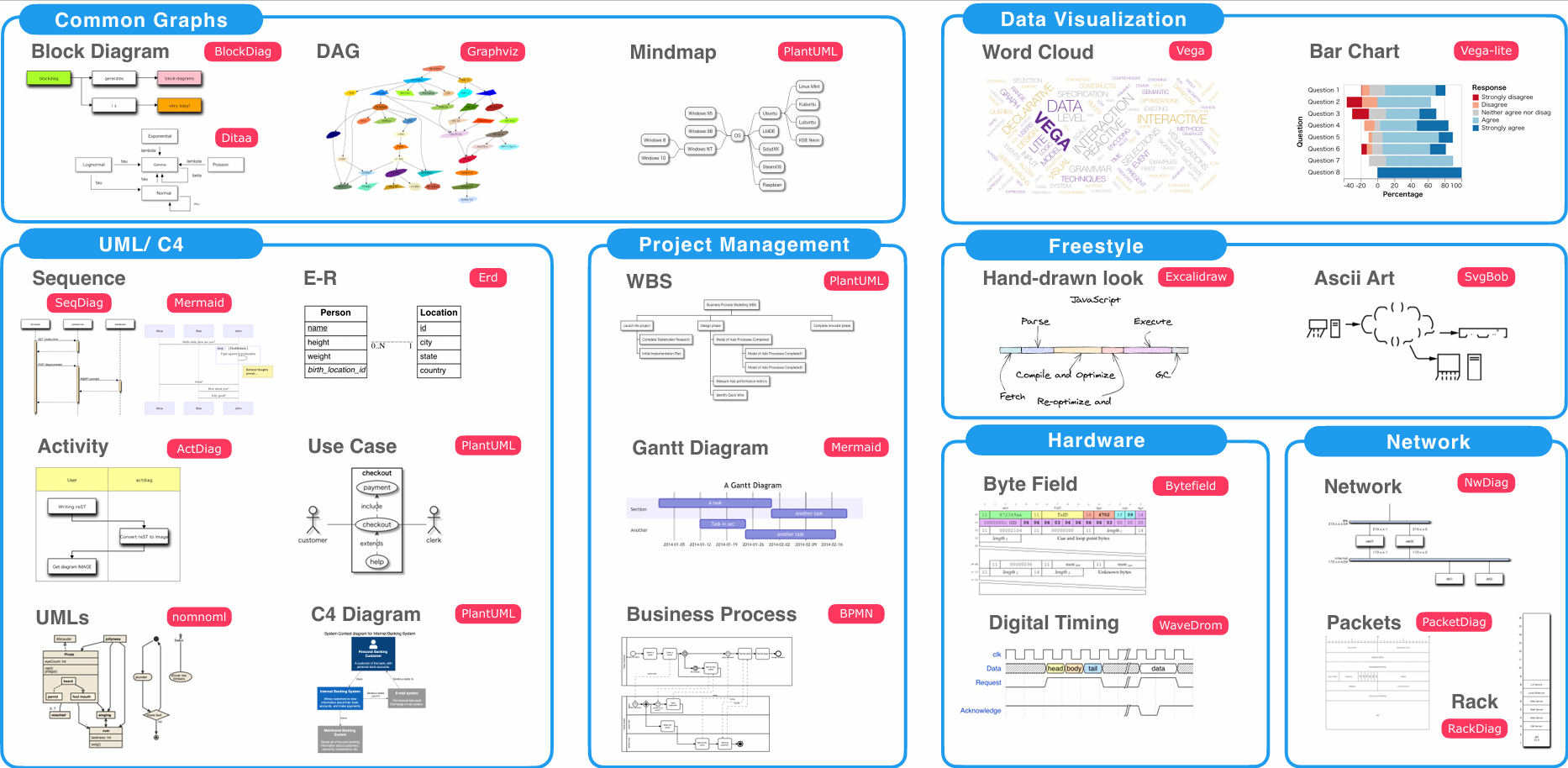 CategoryExamplesArchitecture / SystemsPlantUML, Mermaid, C4-PlantUML, D2Infrastructure & CloudDiagrams.net, GraphViz, D2Workflow / BusinessBPMN, Flowchart, State MachineDatabaseERD (Entity Relationship)Network TopologyGraphViz, Mermaid, PlantUML DeploymentUI / UXWireViz, WaveDrom