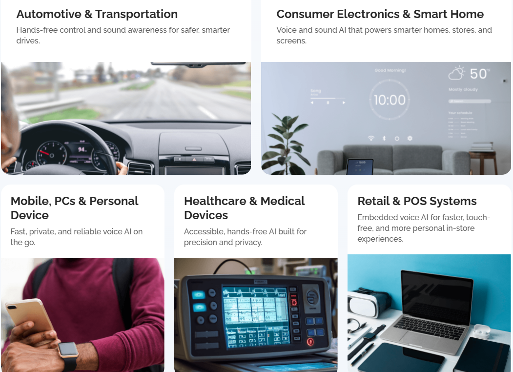 Sensory’s solutions are used across numerous industries including automotive hands-free systems, smart home assistants, consumer electronics, medical devices, and point-of-sale terminals.