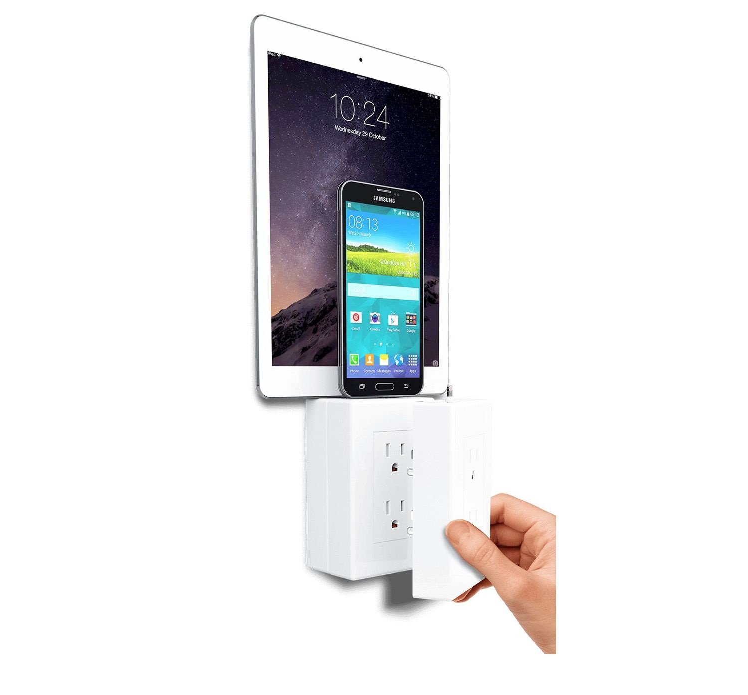 thingCHARGER provides a simple, elegant new way to charge your devices. Just plug thingCHARGER into any regular upright wall outlet, this device does NOT work with horizontal outlets or GFI outlets, please check that your wall outlet fits these conditions before purchasing this item. The underside of the device hides two USB outlets, just in case you need to plug in. You can easily charge any phone, tablet or reader from any brand. The outlets on the front exactly match the prongs on the back, so you can stack two or three thingCHARGERs together for a super-convenient charging station.