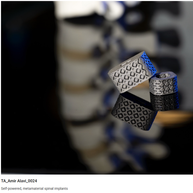 “We can scan the patient’s spine and then design and print the cage to fit perfectly. There are different types of porous, patient-specific cages in the market, but ours is a metamaterial system with full control over stiffness and, more importantly, the ability to generate its own power, which we use not only for monitoring but are now working to apply for electrical stimulation as well.”